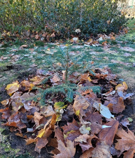 Wir hoben ein Loch mit einem ungefähren Durchmesser von 1m aus. Das Loch füllten wir mit lockerer- und torffreier Pflanzenerde auf und vermischten diese. Zwischendurch wässerten wir die Erde, bevor wir den Weihnachtsbaum eingesetzt und die Ränder mit lockerer Erde aufgefüllt haben. Dann traten wir die Erde fest, sodass ein Gießrand entstand. Dann wässerten wir den Weihnachtsbaum, bis eine Pfütze die ganze Fläche bedeckte. Nachdem das Wasser eingesickert war, deckten wir die Wurzeln mit einer Laubauflage rundherum ab, um ihn vor Frost zu schützen. Ist das Wetter trocken, muss an frostfreien Tagen gegossen werden. Ebenso sollte in den ersten Standjahren im Sommer gegossen werden. Des Weiteren sind keine Schnitte nötig.