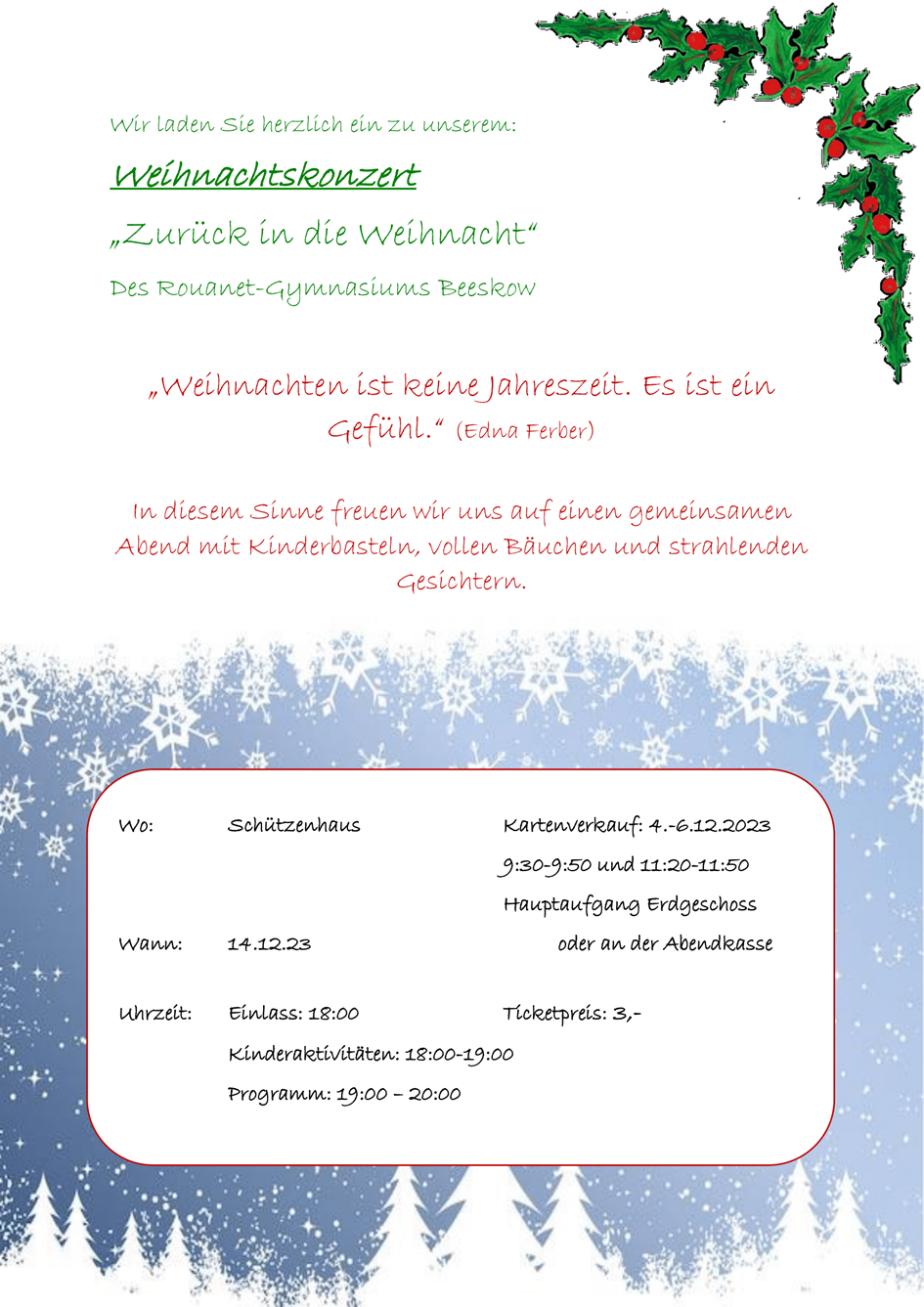 Der Jahrgang 10 heißt Sie somit herzlich Willkommen zum weihnachtlichen Winterspektakel 2023 des Rouanet-Gymnasiums Beeskow. Wir freuen uns auf einen gemeinsamen Abend mit vollen Bäuchen und strahlenden Gesichtern.