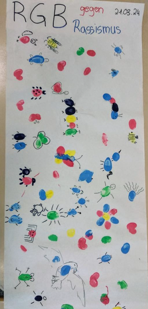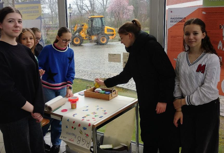 Auch wir engagierten uns am 21.03.2024, dem internationalen Tag gegen Rassismus und für Menschenrechte und Vielfalt. Damit waren wir eine von über 4000 Aktionen in Deutschland. Im „Glaskasten“ haben wir viele vorbeikommende Personen angesprochen. Sie sollten im wörtlichen Sinn „Farbe bekennen“ und ihr „Zeichen gegen Rassismus“ setzen. Heraus kam ein 3,92 m langes Transparent mit bunten Fingerfiguren. Leider waren die 9. Klassen im Praktikum und auch durch die Regenpause befanden sich nicht so Viele auf dem Schulhof wie erhofft. Deshalb beabsichtigen wir, die Aktion im nächsten Jahr größer aufzuziehen und unser Ergebnis von diesem Jahr zu übertreffen.